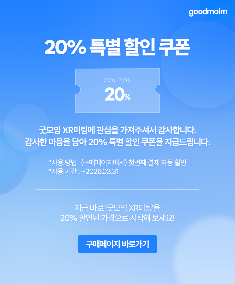 ‘굿모임 XR 시티(XR Space)’와 연동하여 팝업스토어, 브랜드관, 기념관, 투표관, 온라인 총회, 설명회, 세미나, 고객센터 등을 운영할 수 있습니다. (엔터프라이즈 기능)